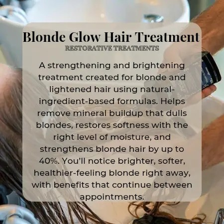Blonde hair requires specialized care to stay strong, reflective, and healthy over time. This professional treatment is designed to support lightened hair by helping rebalance moisture, reinforce weakened areas, and restore luminosity that can fade from daily stress, minerals, or heat styling. Your service includes a customized cleanse, targeted treatment application, relaxing scalp massage, and finished styling to help seal in results. Hair feels more resilient, more manageable, and visibly brighter immediately after your appointment. Recommended for clients who color, highlight, or lighten their hair and want to maintain long-term strength and shine.