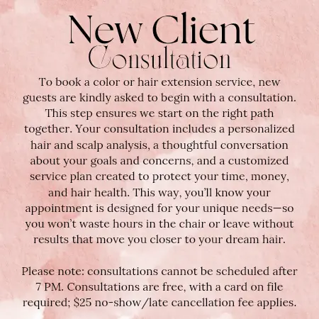 To reserve your consultation, a card is required on file. While your consultation is complimentary, a $25 fee applies only in the event of a no-show or late cancellation. This allows me to provide each guest with the time, care, and attention they deserve. Thank you for understanding — it allows me to keep every appointment focused, relaxed, and just for you.